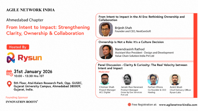 Agile Network India is organizing an In-Person event on “From Intent to Impact: Strengthening Clarity, Ownership & Collaboration”. The event will be held on 31st Jan, 2026 at @Ahmedabad.