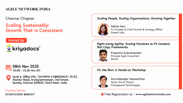 Agile Network India is organizing an In-Person event on “Scaling Sustainably: Growth that is Consistent”. The event will be held on 08th November, 2025 at @Chennai.